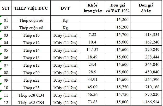 Giá thép Việt Đức tham khảo (đã bao gồm thuế VAT 10%)