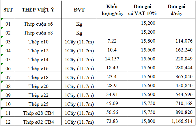 Giá thép Việt Ý- tham khảo