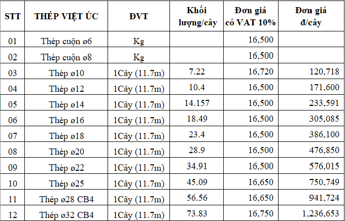 Cập nhật giá thép Việt Úc mới nhất hôm nay (tham khảo)