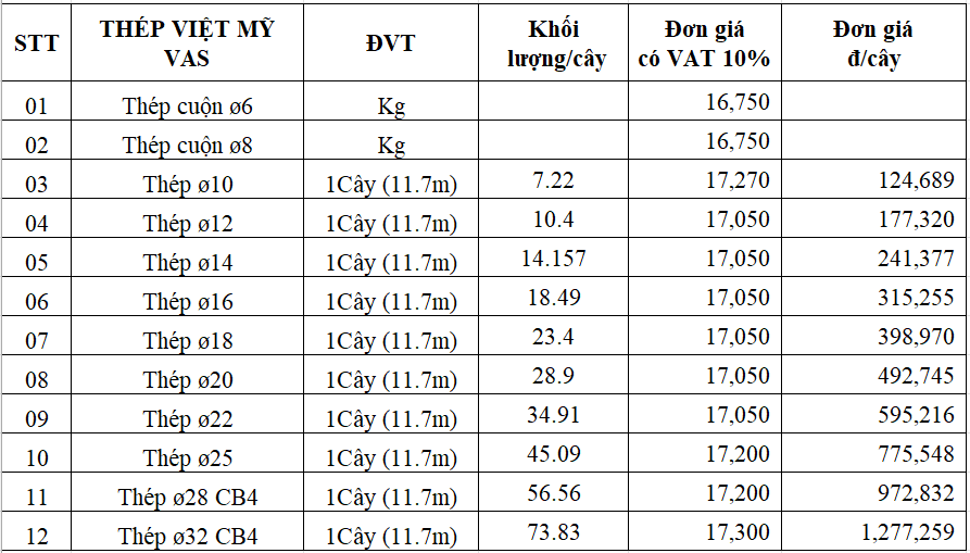 Bảng giá thép Việt Mỹ (VAS) mới nhất 2026 (tham khảo)
