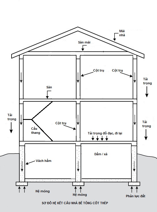 Cột và dầm là khung chịu lực chính của nhà ở 3 tầng.